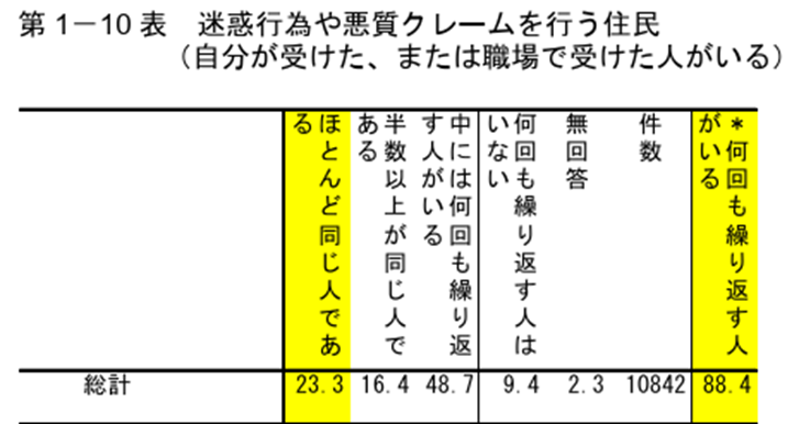 一例として、自治労(全国日本自治団体労働組合)が2020年に全国1万9千人の公務職務従事者を対象に実施したアンケート『「職場における迷惑行為、悪質クレームに関する調査」報告書』でも、約9割の職員が、迷惑行為や悪質クレームを同じ住民から繰り返し受けているとなっていました。